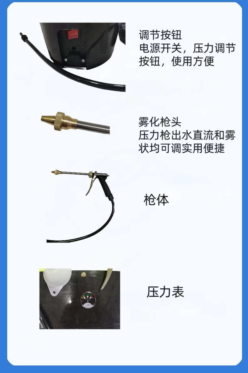 2、由电动锂电池、充电器、枪体、连接管、水箱组成;