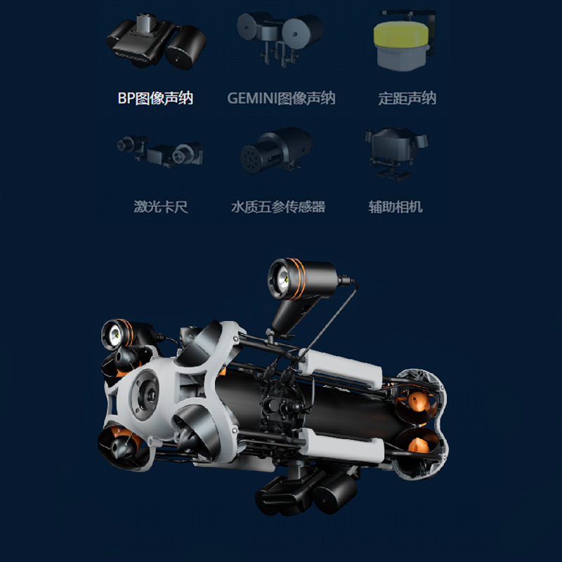 械手、金属探测仪、水质传感器(溶解氧、PH)、激光卡尺、外部供电、声纳、USBL;