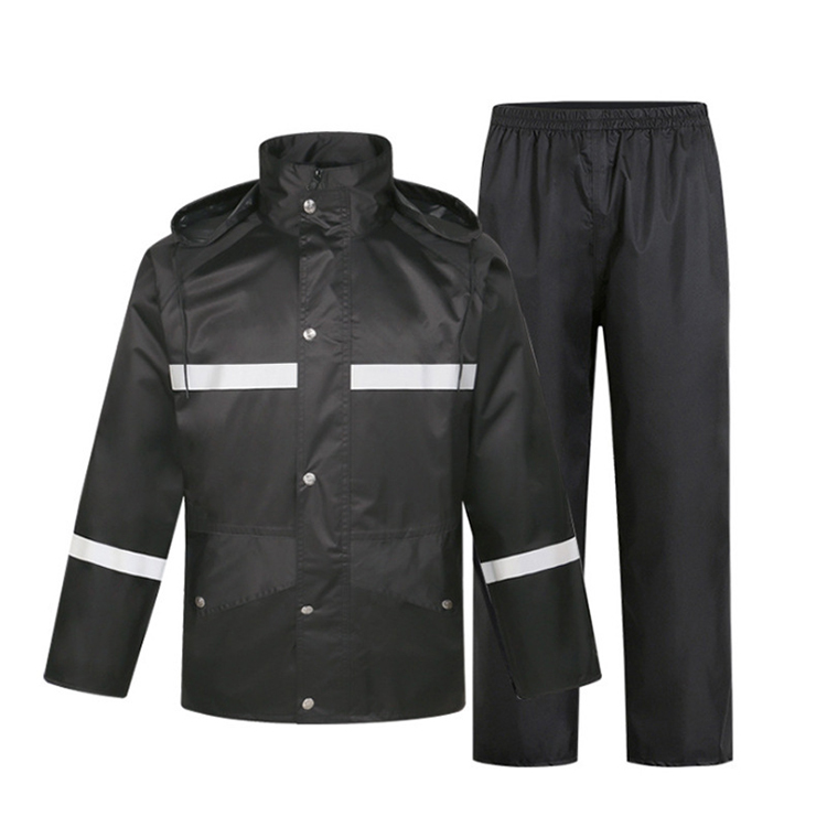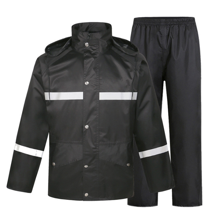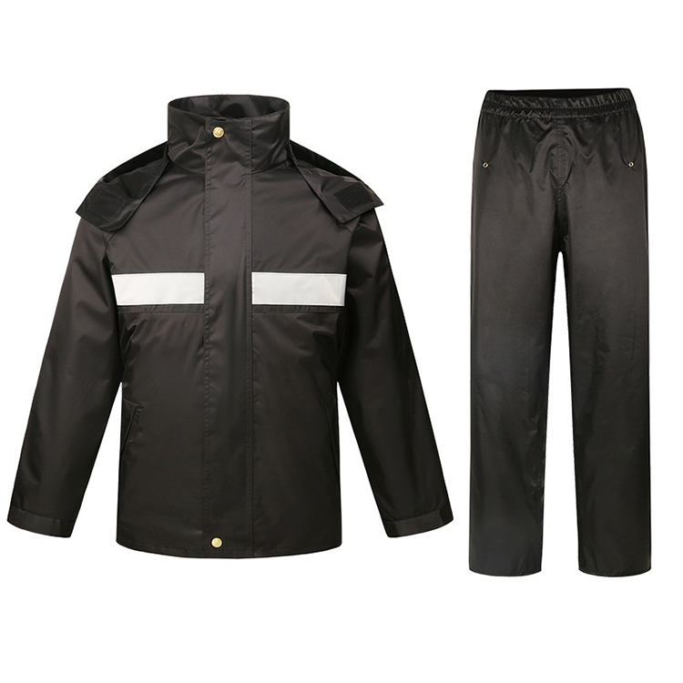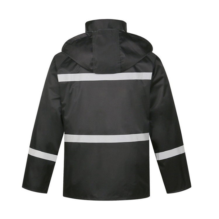 雨衣双门襟配合魔术贴,按扣的设计,不易渗水。此款帽子收纳在农领处,用时可拿出,人性化设计。内衬透气网,雨天作业透 气舒适,不闷热。