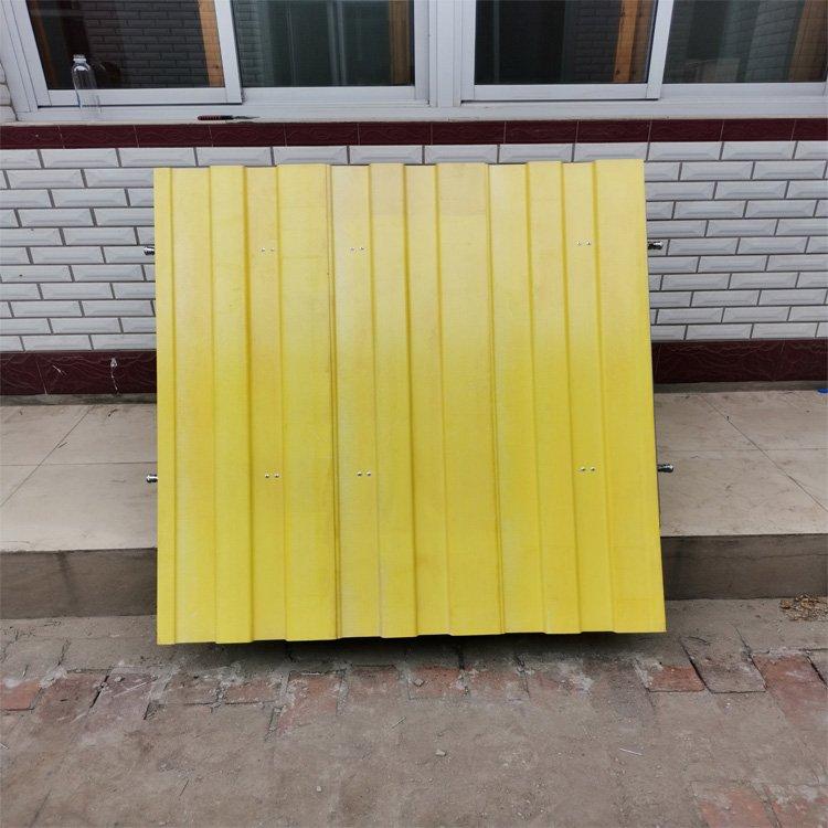 (3)挡水面板:采用波纹玻璃钢材料之间通过轴链接并通过固定装置与横梁连接成一体。