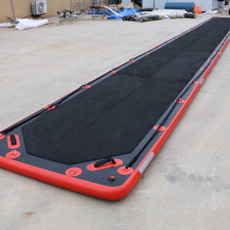 移动的气动救援浮桥,它能使救援人员在冰面、水面、沼泽地面或其它不稳定的地面上快速有效地进行搜索、救援等工作。通过与压缩空气瓶直接连接的充气软管对救援浮桥进行充气。救援操作完成后,浮桥的放气操作可通过排气装置来完成。低压操作,操作快捷,阀可避免充气过量,采用耐磨材料制成,四周有发光带方便夜间操作,特殊的边缘设计,可轻松拖拉通道上的人员。