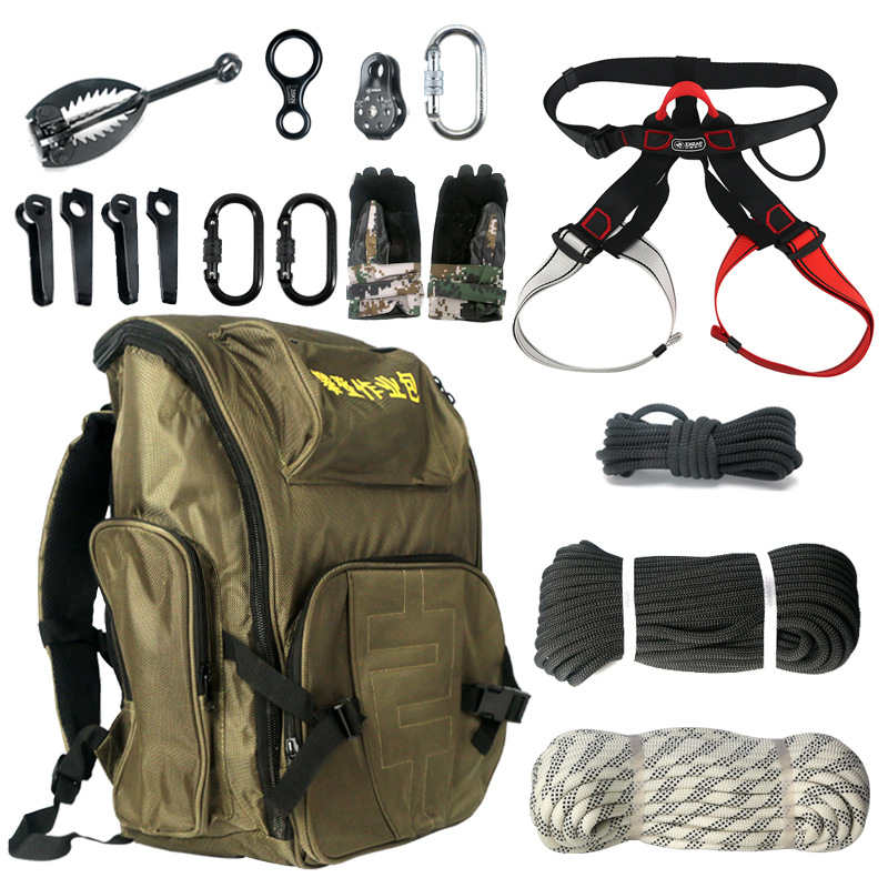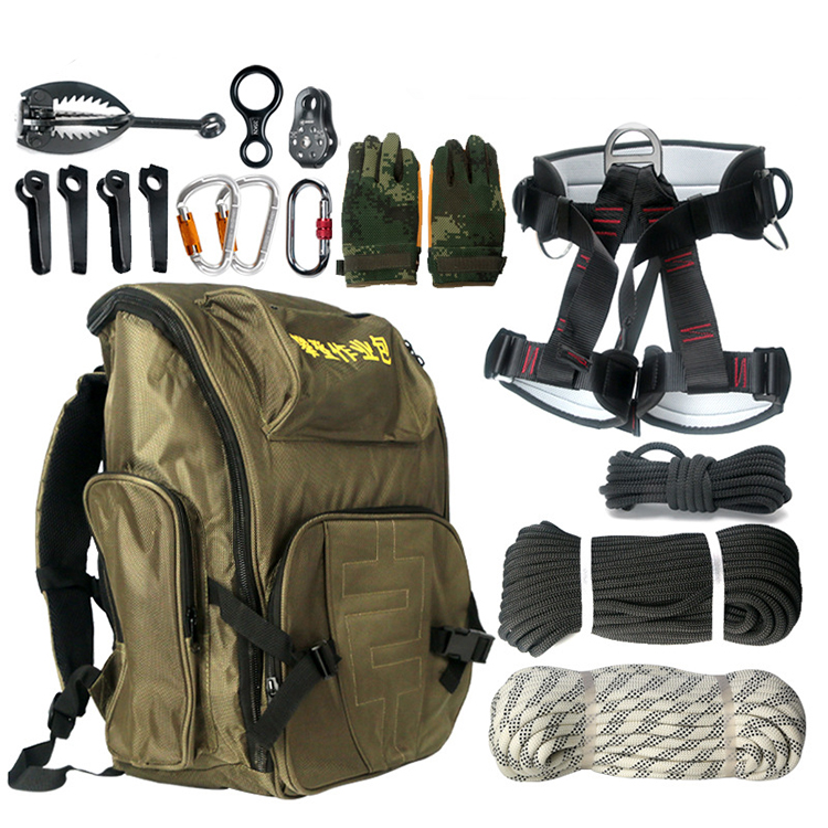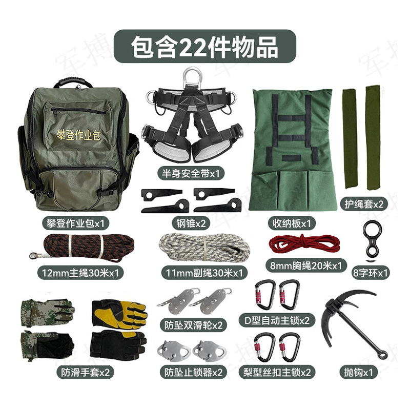 水域攀登救援绳索套装:有零件插板袋,承重紧凑,后背透气海绵设计,舒服内置装备:坐式半身安全带、抛钩、攀岩手套、登山绳12MM、登山绳11MM、辅绳6MM、D型丝扣锁( 航空铝)、O型丝扣钢锁、8字环下降器、钢锥、单滑轮、银色0型丝扣钢锁、黑色0型丝扣钢锁等。