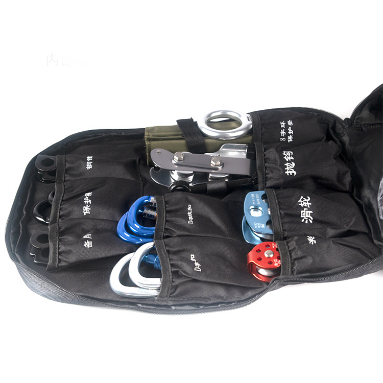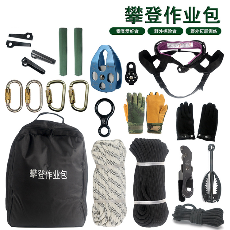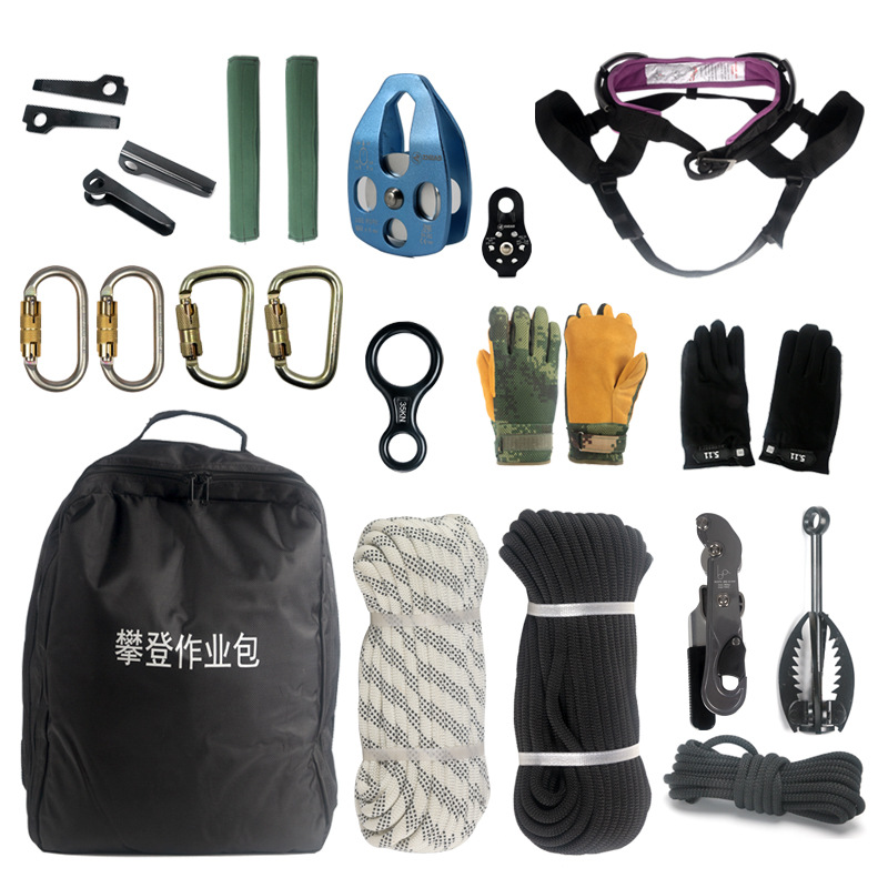 组件包括:安全绳50米1根,8字环2个,高强度铝合金自动D形钩6个,2类安全吊带1根,3类安全吊带1根,防恐慌下降器1个,半锁扣2个,手持上升器1个,胸式上升器1个,脚式上升器1个,脚踏带1根,游动止坠器1个,锚点扁带2根,挽索2根,单滑轮1个,滑降手套2双,器材包1个(器材包能容纳下全部装备)、绳包1个,绳索护件1套(包括黑色绳索护套2个;绳索护垫1个)。