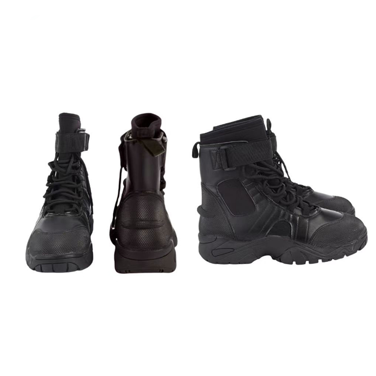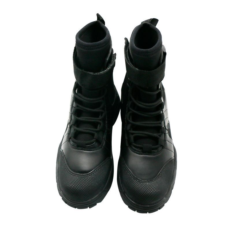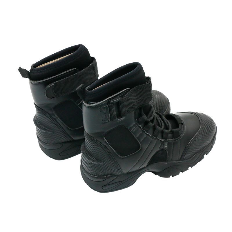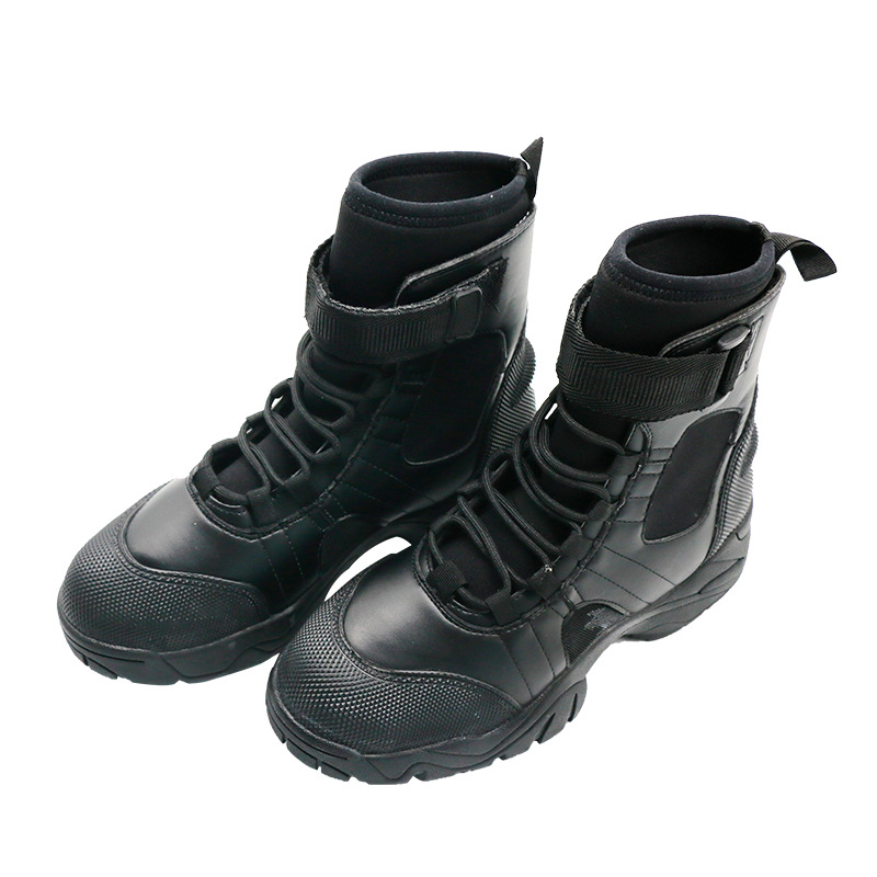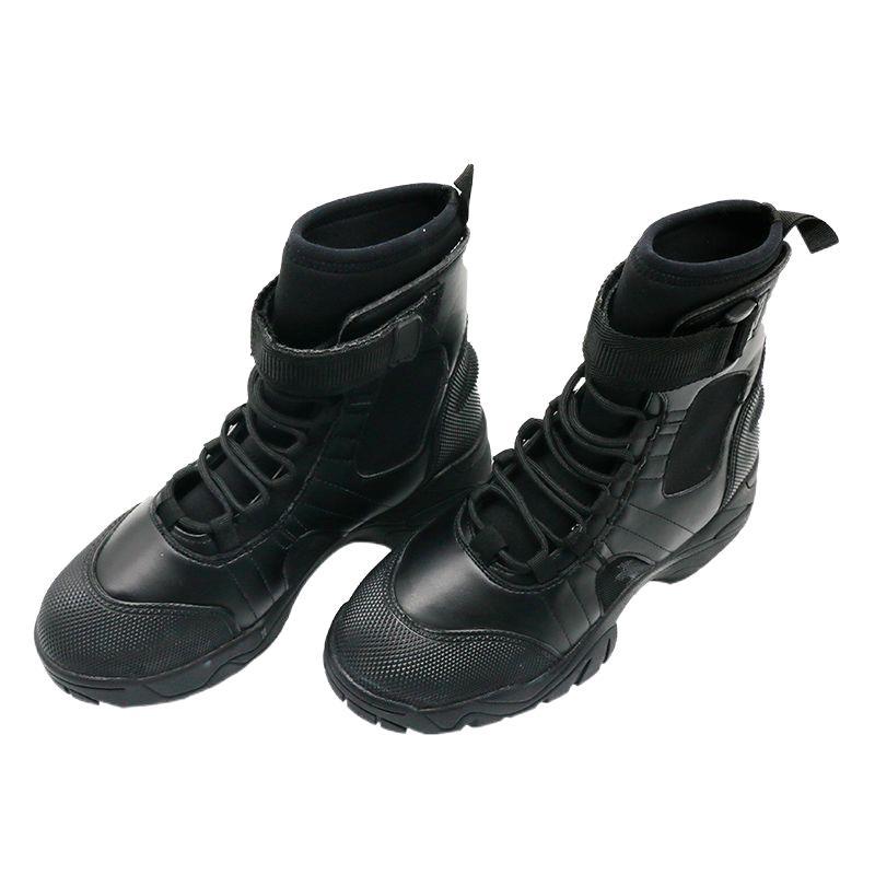 消防员水域救援靴,适合水域救援和岸上行动;整体是系带和魔术贴加固设计,鞋面为5mm氯丁橡胶涂层;靴口为可调魔术贴,便于收紧及快速穿脱。鞋内垫为7mm氯丁橡胶垫,可提供好的减震性,穿着舒适;加厚防滑大底适合水面和陆地各种地形;脚后跟有设计搭配脚蹼一起穿用;防滑加厚大底:适用于复杂的地形,易行走;鞋:鞋带加魔术贴