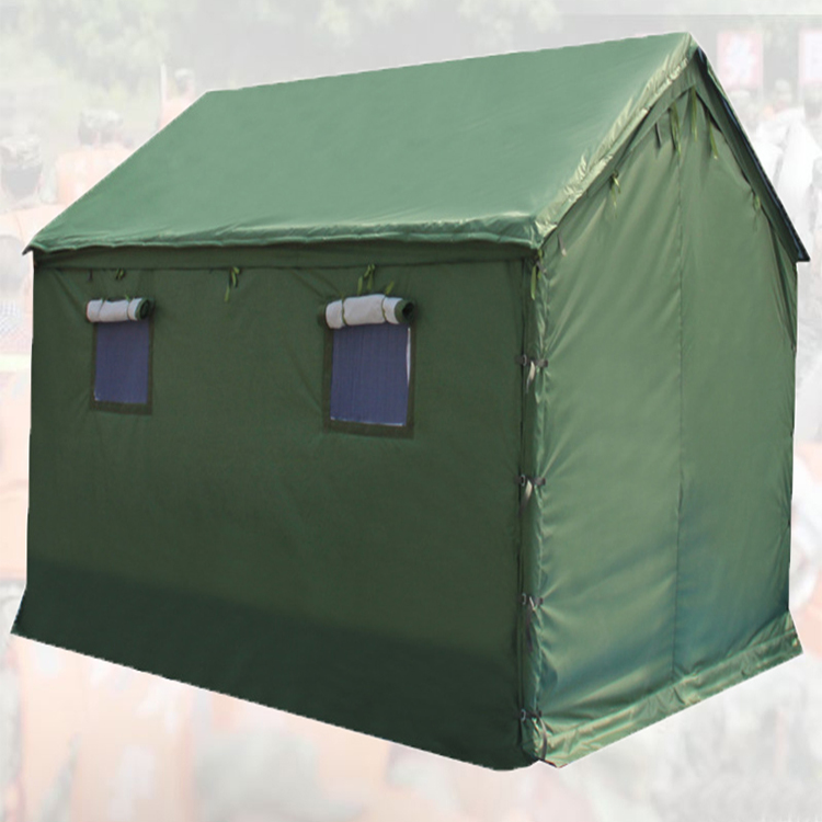 2、样式;救灾12平方米棉帐篷为长方形双坡面直墙建筑样式。一端山墙开门,门上正中有风斗,另一端山墙对应位置有烟囱口,两侧墙各开两个窗户,整体帐篷通过拉绳连接三角桩固定。