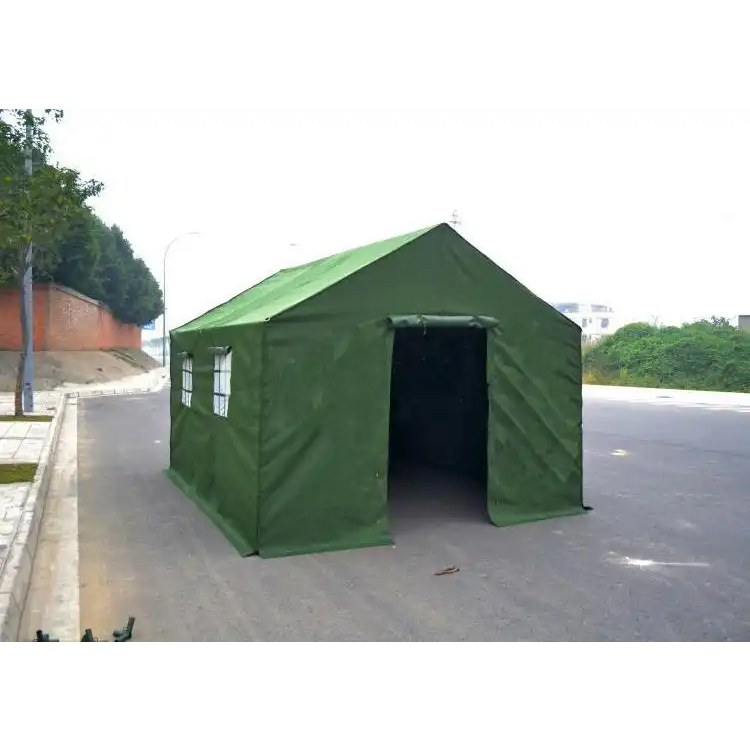 1、以涤纶PU涂层布为篷体材料、以铝合金为框架材料和棉内胆组合而成的救灾 12平方米帐篷。