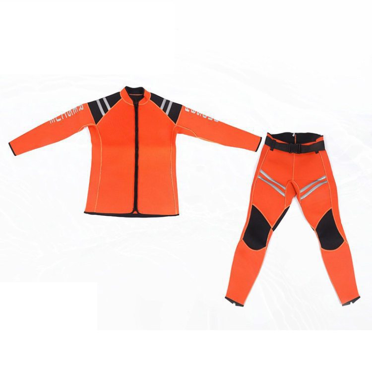 颜色橘红,分体式设计,前处拉链上衣和系带长裤,方便穿脱,面料用高弹CR 氯丁橡胶材质厚度≥4mm
