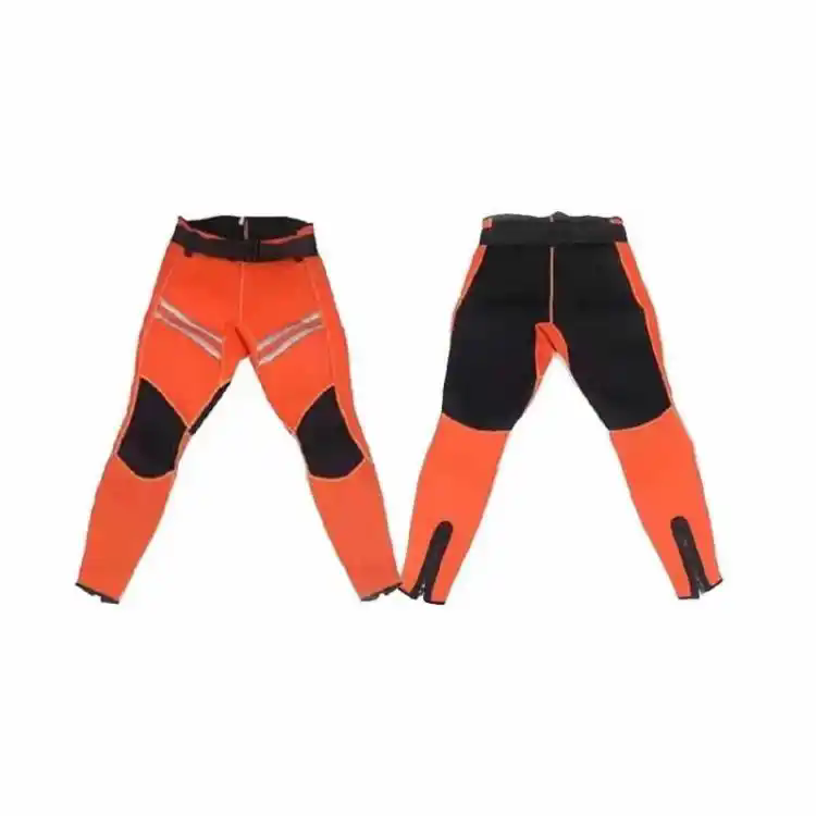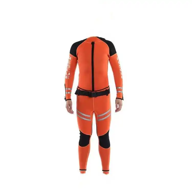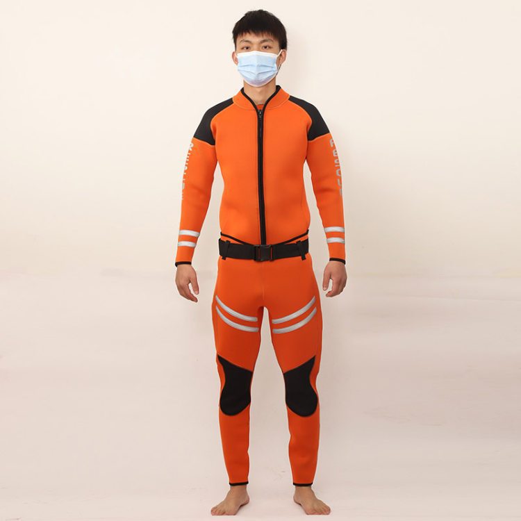 1.颜色橘红,分体式设计,前处拉链上衣和系带长裤,方便穿脱,面料用高弹CR 氯丁橡胶材质厚度≥4mm;