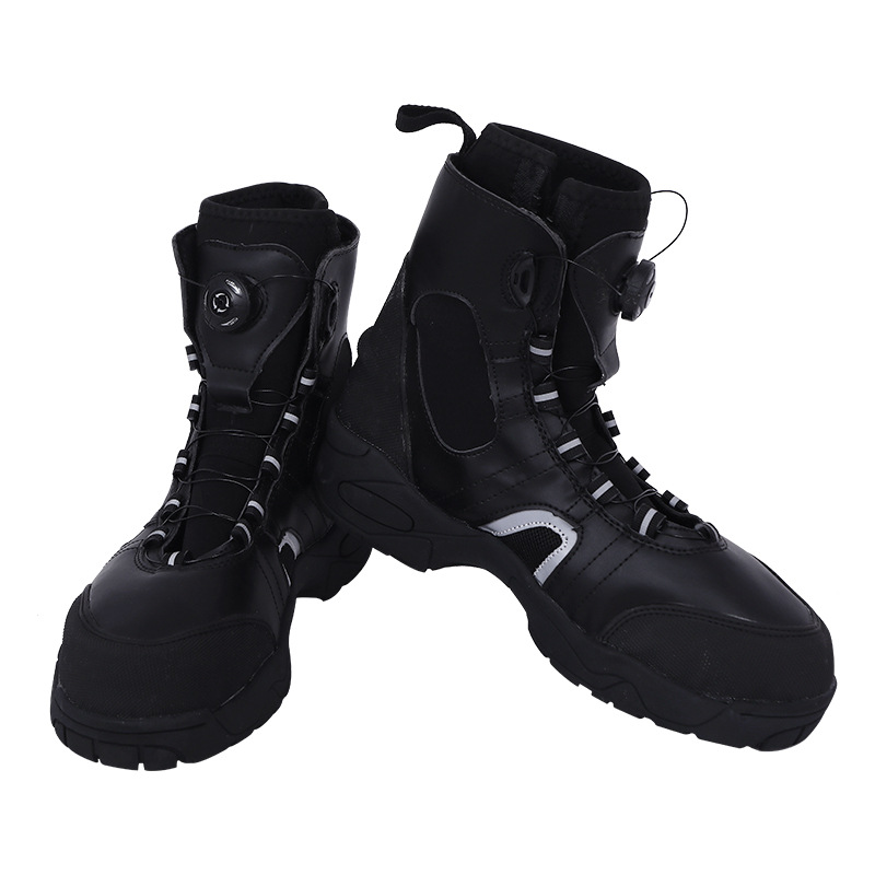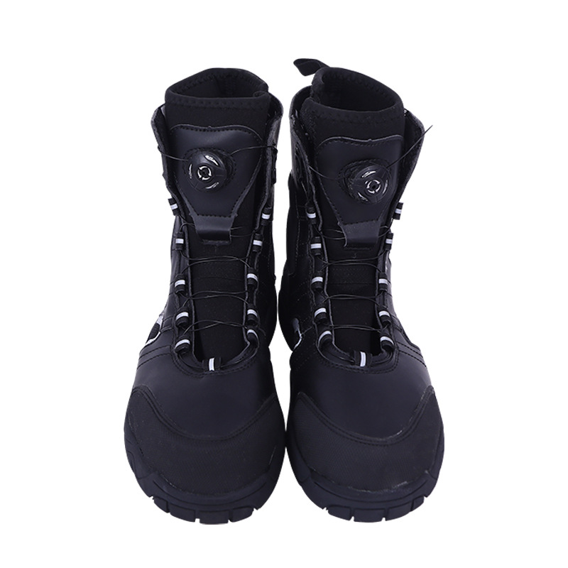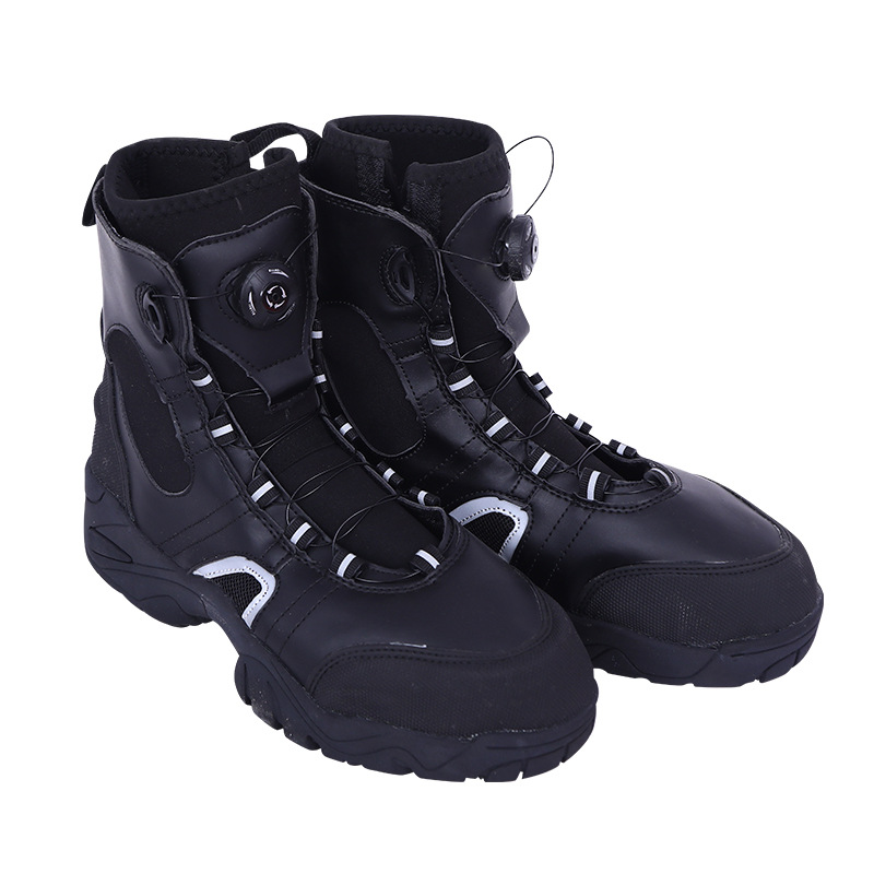 水域救援靴由靴头、靴外底、靴跟、靴帮、靴内底等。 鞋面合成皮革和5mm 厚的氯丁橡胶料制成;