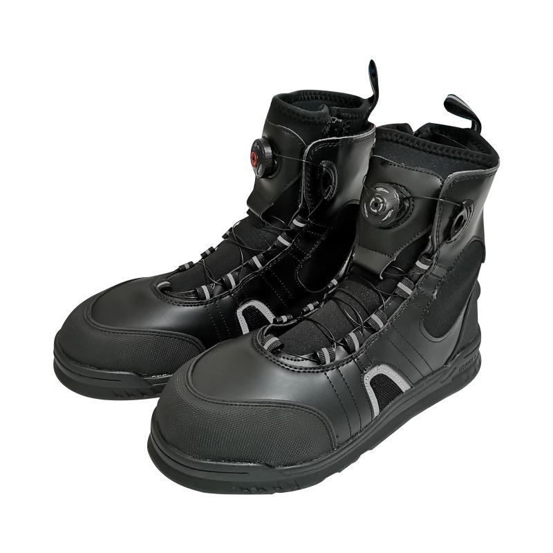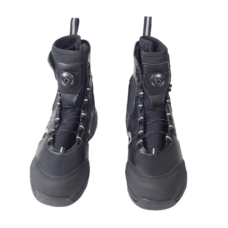 有弹性潜水材料内胆,鞋头有 PU 防撞保护,钢包头防砸,鞋底防刺穿;