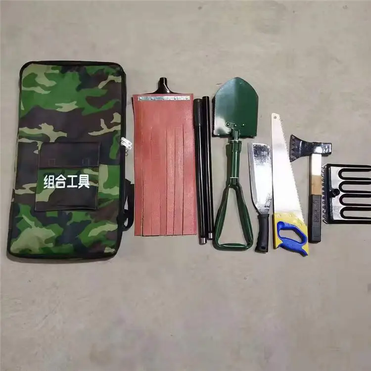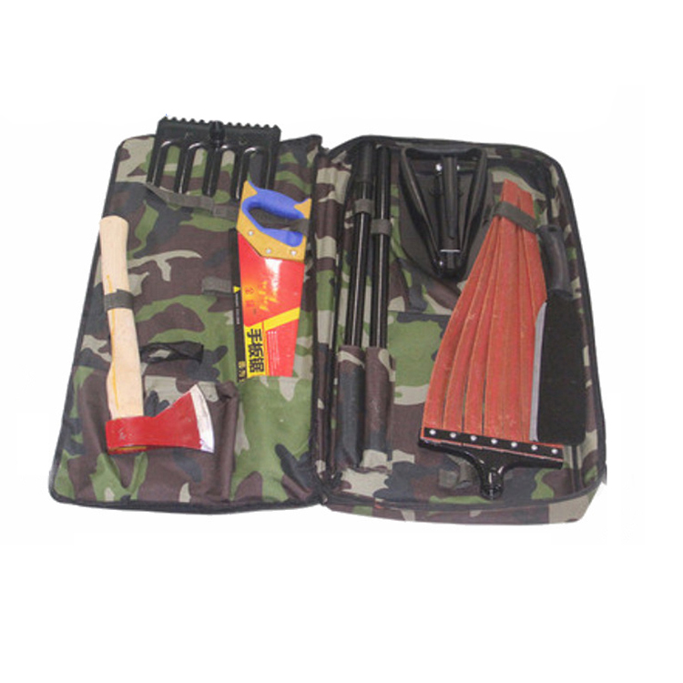 配置工具8件套:砍刀、伐木斧、锯、锹、扑火拍、五齿耙、伸缩式连接杆、工具包8件套。连接杆与锹、扑火拍、五齿耙任意连接,携带方便,多用途。