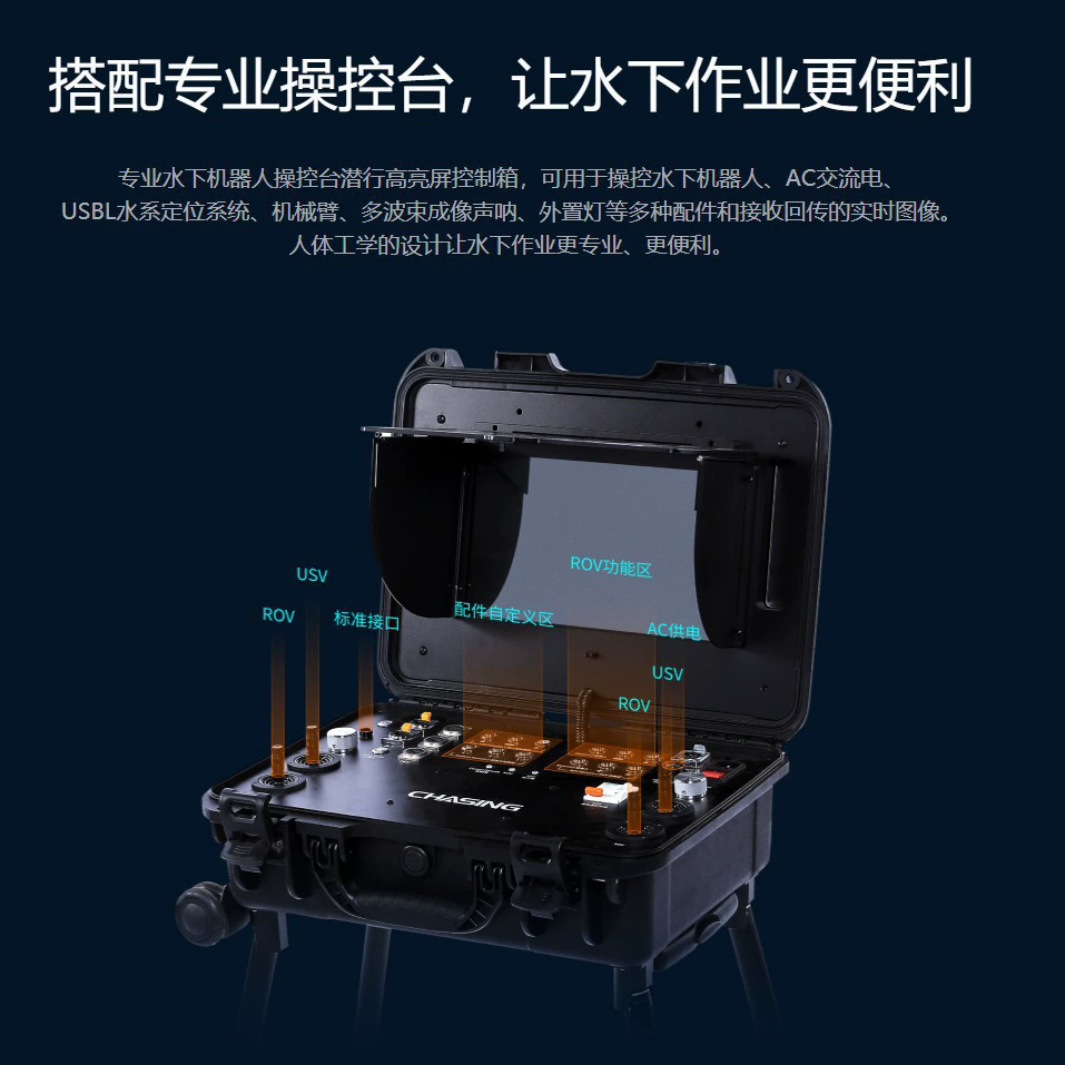 内置4K/1200万像素EIS防抖相机、4000流明LED的、可拆卸/换电池,铝合金挤凑机身(重量小于4.5KG、),一个人可3分钟部署,轻便、易用、靠谱的搜救型水下机器人,使用于水下勘察、水域救援和水下打捞的利器。