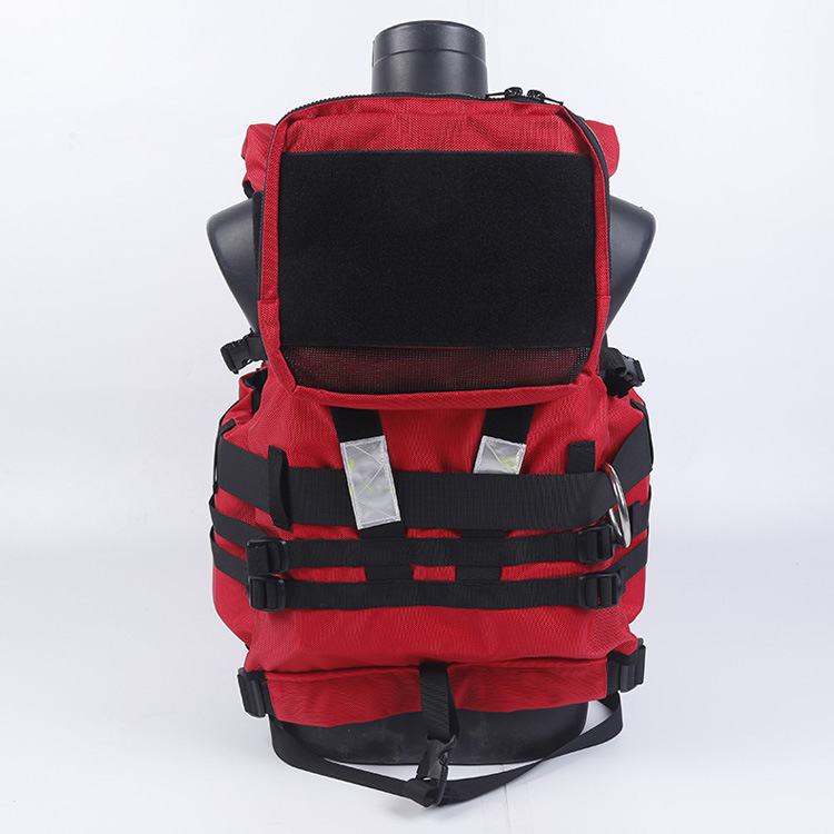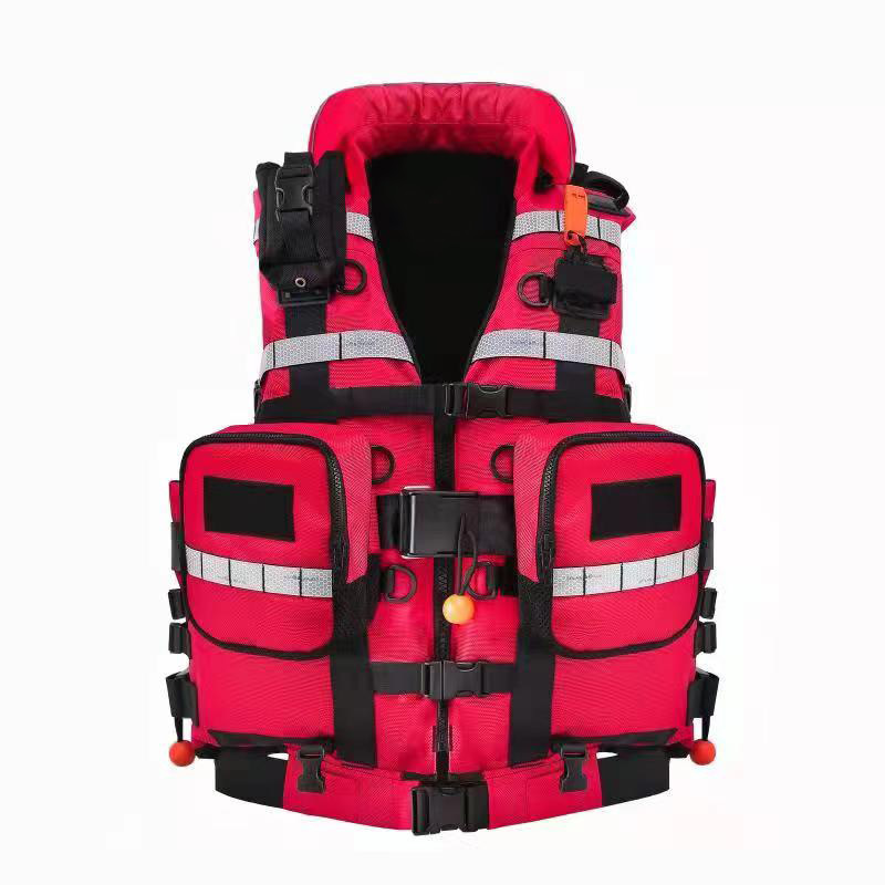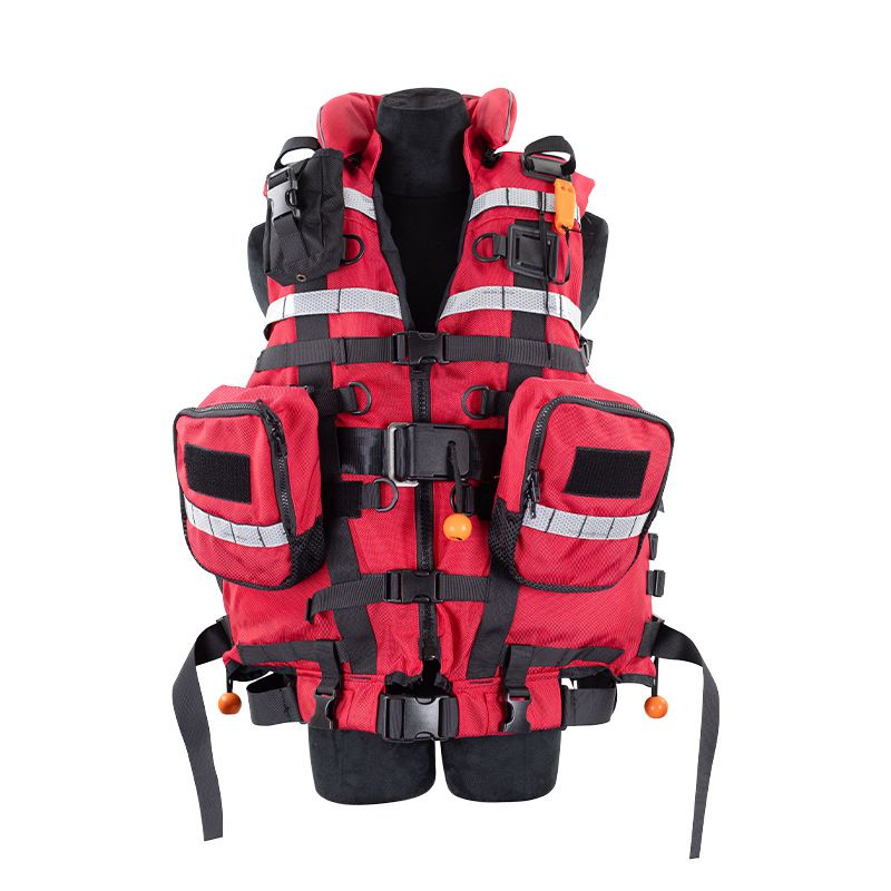 救生衣配备:可拆卸对讲机包1只、可拆卸救生口哨(非滚珠类)1 只。产品Y势:>90KG成年人获向上漂浮力(救援工作中可双人浮力装备使用);注意事项:避免与重物挤压造成泡棉变形损失浮力,避免尖锐物割损;避免与腐蚀性物质接触;用前检查各连接处、配件;使用后请用清水冲洗自然晾干,后存放装备柜内。防水提格牛津布面料; NBR/PVC 二次发泡闭孔泡绵浮力材料,川型立体裁剪;用耐磨尼龙织带; 技术要求:1、设计浮力 (N):≥ 150;配备快脱卸救援装置, 含快拉压扣和不锈钢配件;2、活饵救援装置;3、三段式可调腰带, 尺寸调整合身;4、 功能挂点: 四方位卡座≥3个, D扣≥6个;5、两侧快卸装备带,可挂抛绳腰包;6、口袋上配有魔术贴可贴队标。