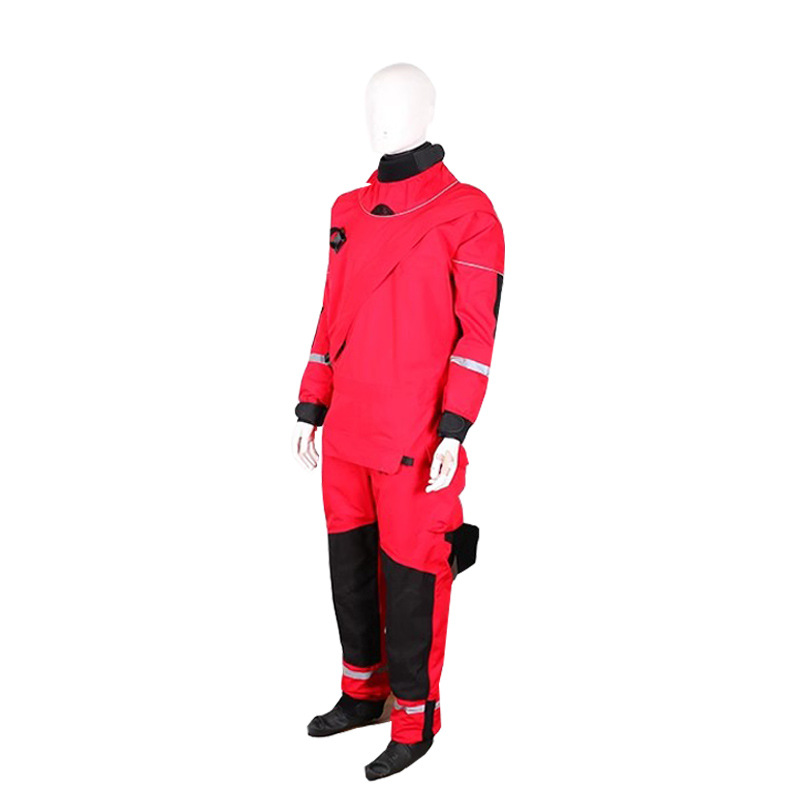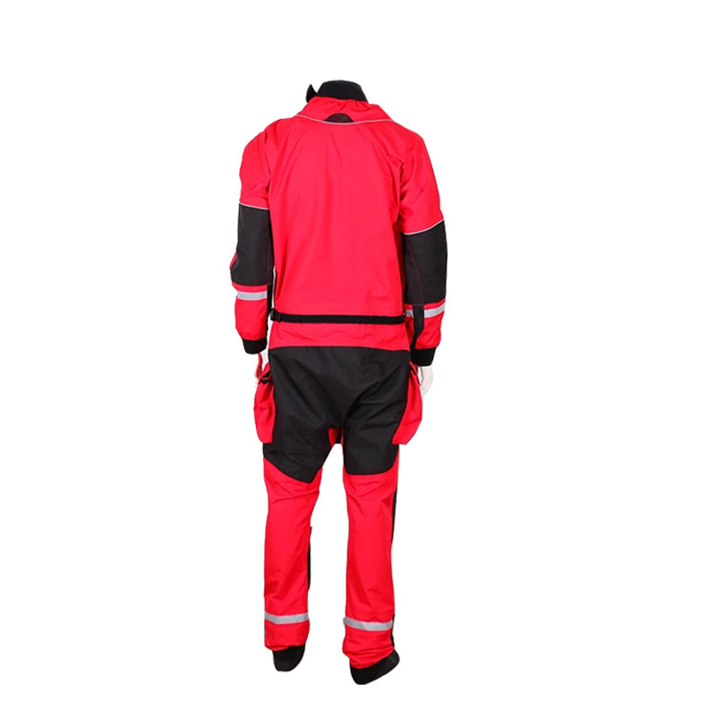7、内置可拆卸吊带,在水中可以穿脱救援服的上半部分 而不渗水;双层材料构成做特殊加固处理;附带一体的乳胶袜套可防水且保脚部保暖;前置的防水拉链不进水,救援人员穿戴方便;缝合处用RSeal材质压合不渗漏;腰部有调节系绳,用于调节舒适度。使用范围:用于水面救援,水域搜救,水上作业等