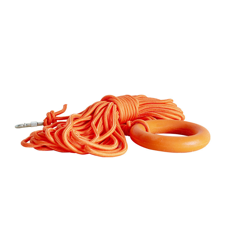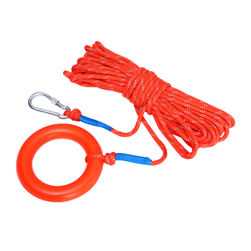 该救生绳选用空芯手工编织制作,在放进河面时绳能够浮在河面上边,采用橘红色反光便于救生设备;
