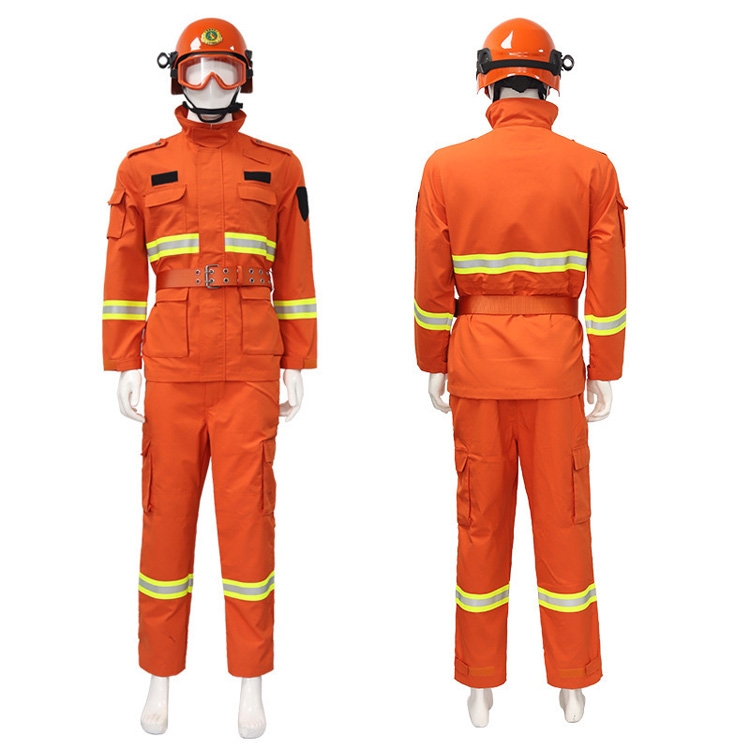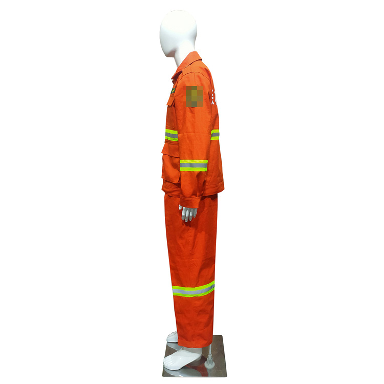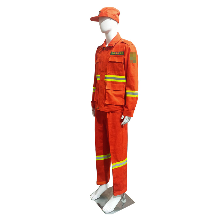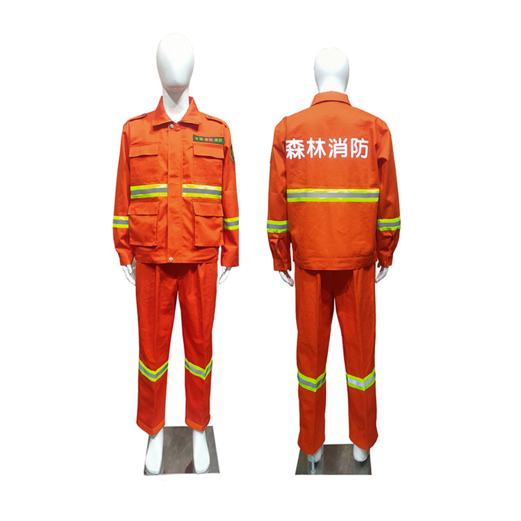 领部可立领和翻领,便于在各种环境下调节使用,胸前配备四处口袋,便于穿着人员可放置随身携带物品等。服装5处前后反光条设计,保护扑火人员的夜间可视度。衣服门襟用四合扣设计,穿脱方便,节省时间。其袖口裤口四合扣铜扣两档可调节。上衣有臂章(尺寸长10cm,宽9cm)胸章(胸前针刺胸标尺寸:长12.5cm,宽2.8cm。),后背有“森林消防”字样,标志性强,突出行业特点。可与头盔披肩结合形成保护。裤腰局部用弹力松紧带设计,根据个人腰围进行调节,两侧裤腿处360°可视反光条设计。