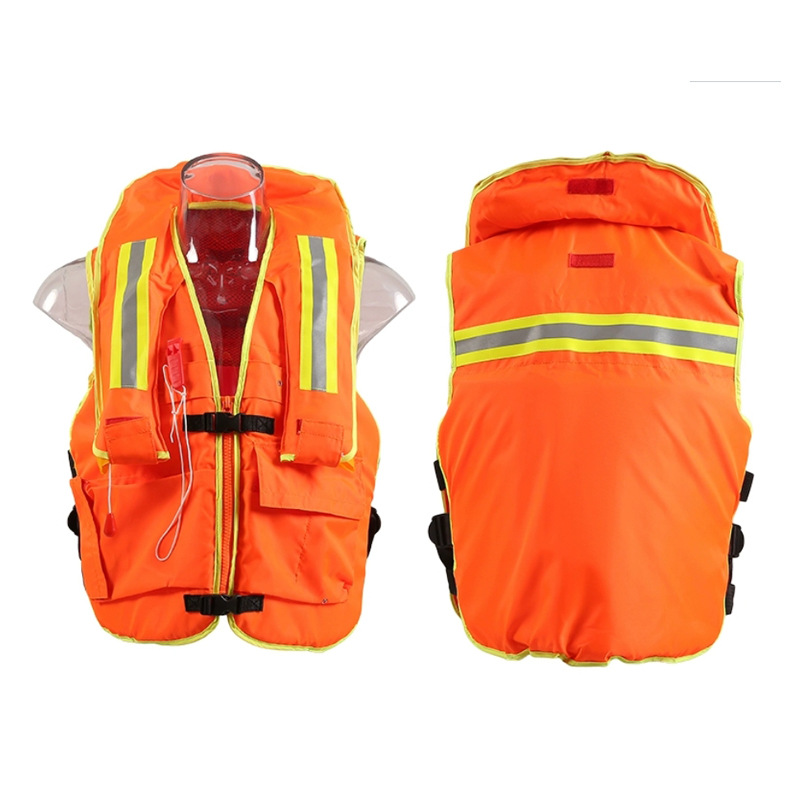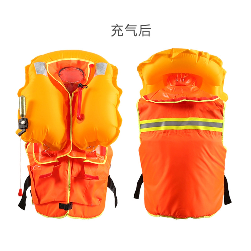 3、救生衣上所携带的气胀式救生圈未充气的状态,体积小便于携带,且操作容易,充气后的浮力大大(≥150N),两个成年人(70kg/人)在水中抓住该救生圈不会下沉。另外本救生衣配了示位灯(灯需另配)、反光条、哨笛等。