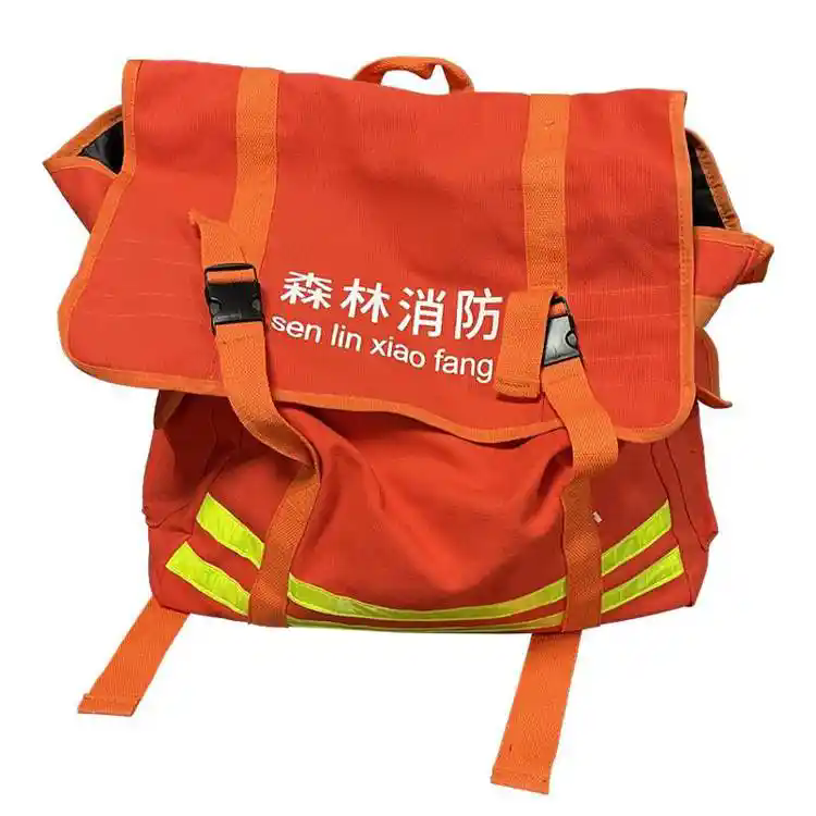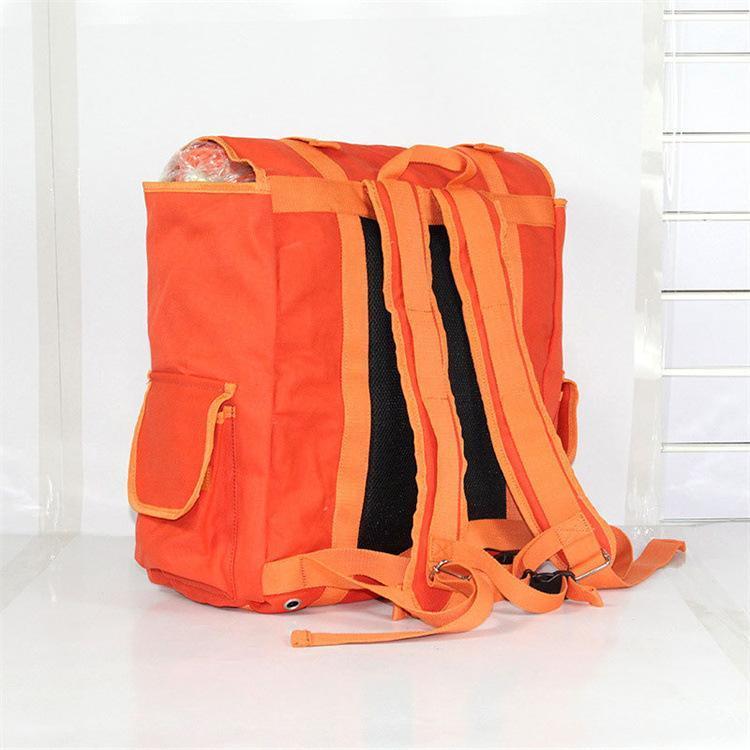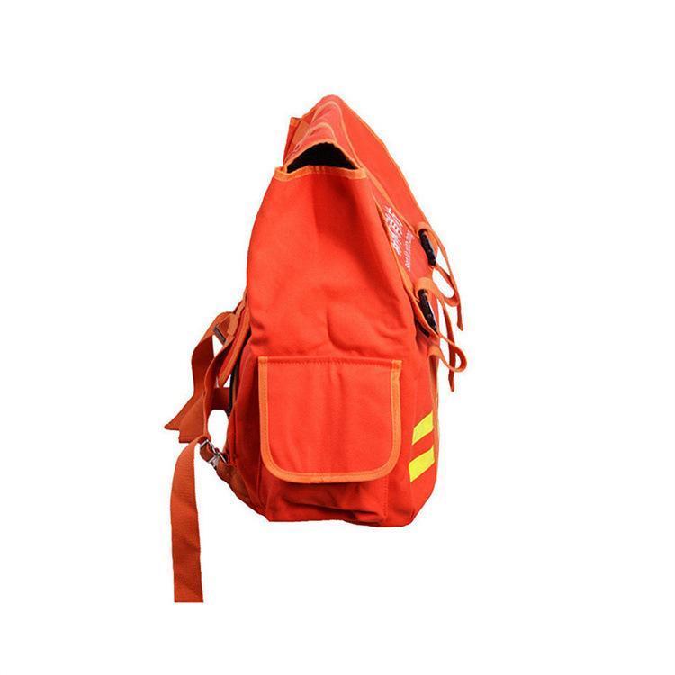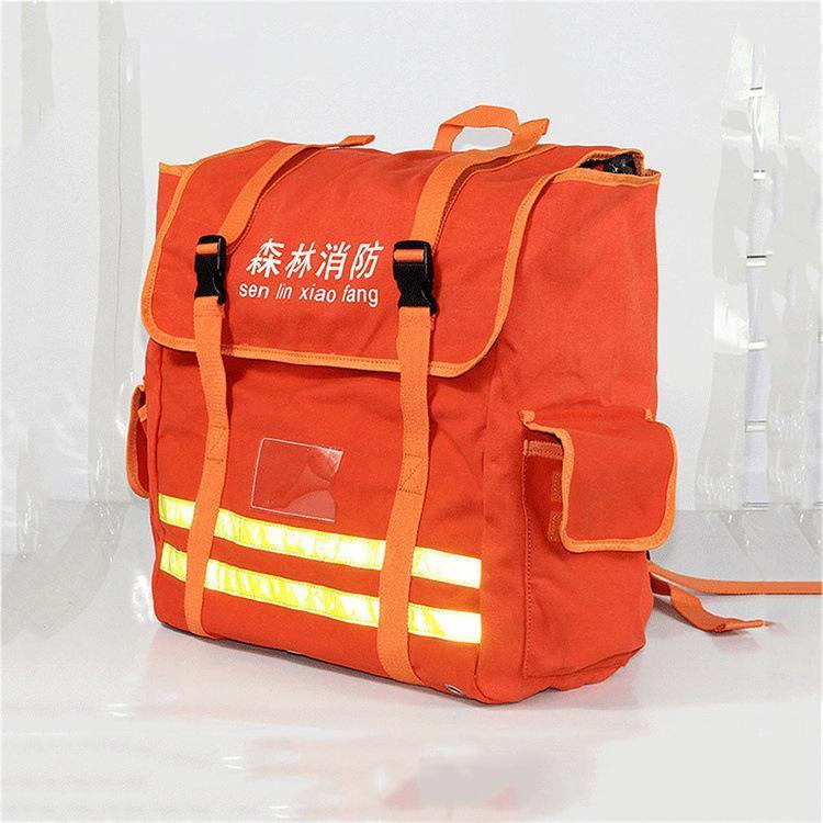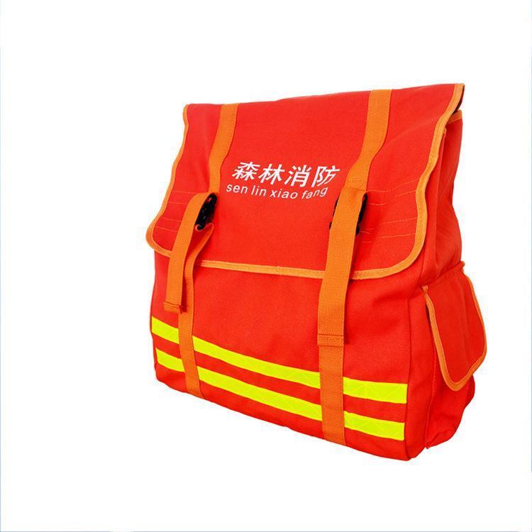 材质: 20 安染色帆布; 颜色: 橘红; 尺寸: 47*29*50cm ; 背包肩带和后背有填充棉,减轻背着重力; 底部有 5-6 个放水孔,背部有两条夜间反光带; 存放 6-8 条水带; 背包背负肩上时可自动放水带。
