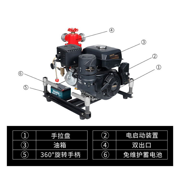 整体结构紧凑、体积小、重量轻、压力大、运行可靠。具有长时间连续运行、冷启动迅速等特点;主要用于城镇、森林、工矿企业灭火,也可用于给消防车供水、城市排涝等,是消防队、森林灭火的装备。