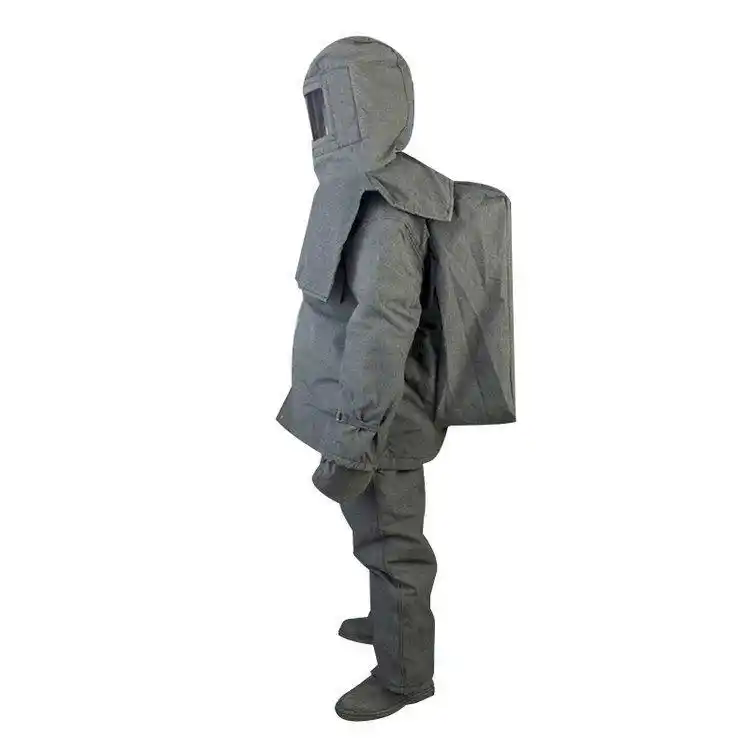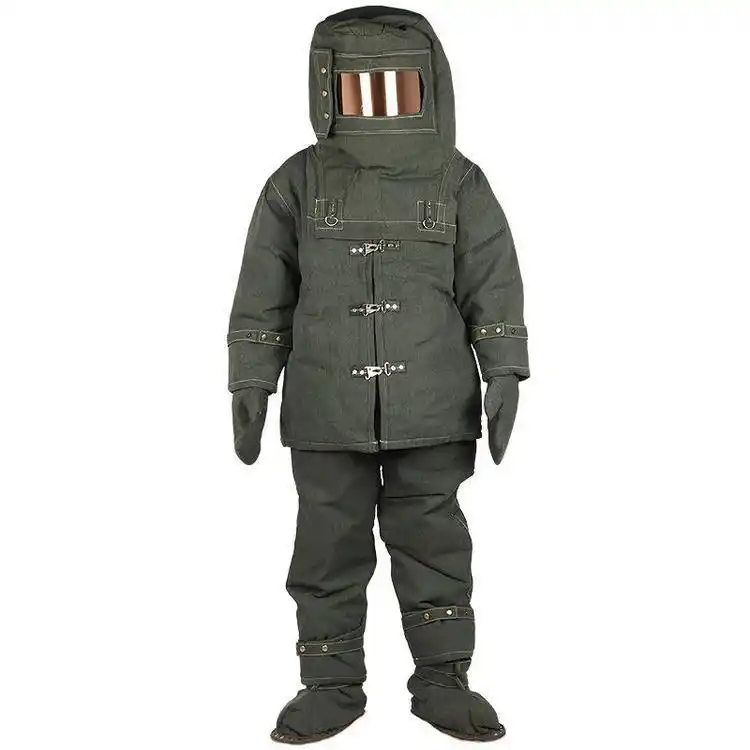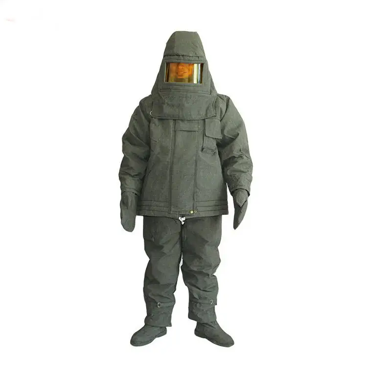 用耐火纤维布、耐火隔热毡、舒适层、防水层等多层结构制成,是消防人员进入火场进行灭火战斗和抢险救援时穿着的服装,是消防队员防护装备一,有防火、隔热、抗辐射热渗透性能。性能参数:防火焰温度850℃,防辐射温度1050℃重量:<12kg特性:有耐火隔热性能,可1000度火焰温度。款式:分体式、连体式。整套服装包含上衣、背带裤、头罩(带镀金视窗,内置消防安全头盔)、防火耐温手套、避火鞋。用途:消防员短时间穿1000度火区抢险救援作业。