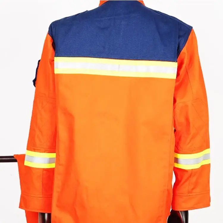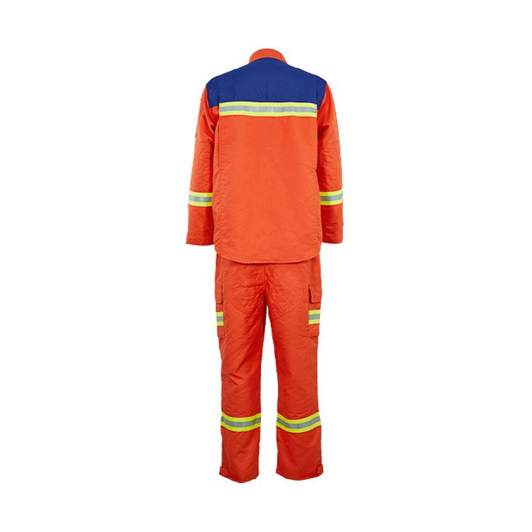 胸处设“V”字形反光标志带,后背设水平反光标志带,袖口和脚口设环绕反光标志带,便于夜间救援增加360°可视度。左右肩部设有两个挂袢。上衣肩背部设计拼接,面料为深火焰蓝色,胸处设置贴袋两个,袋盖为深火焰蓝色。