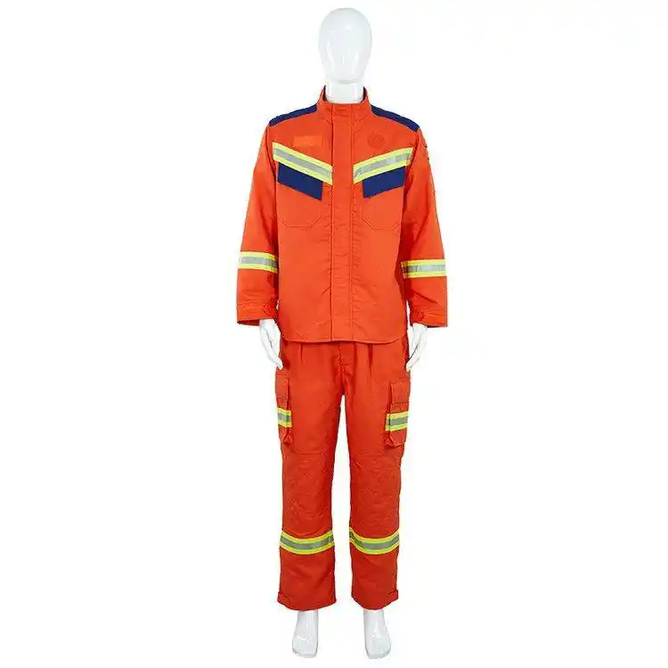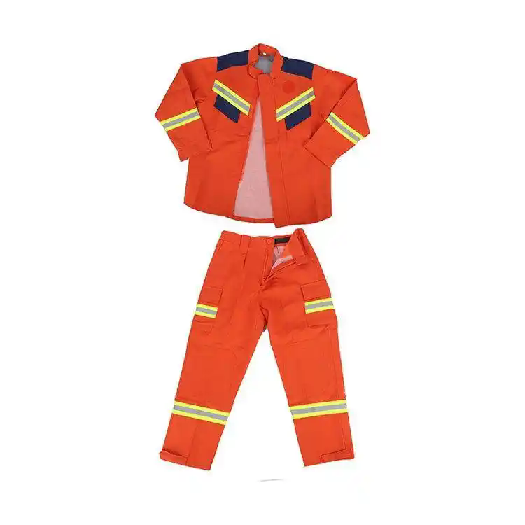 款式为:衬衫式分体抢险救援服。上衣用收腰设计,衬衫式圆弧形下摆,前下摆应能够束入裤腰,且弯腰时后下