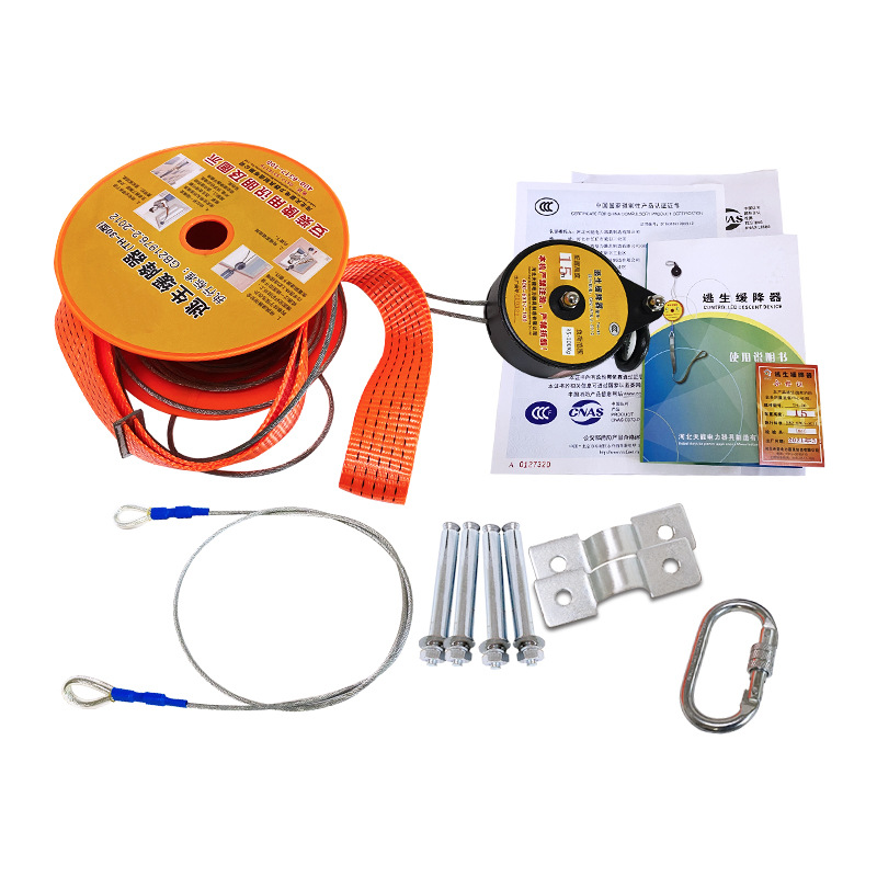 产品配置∶缓降器;绳索盘;安全带*2;固定架*2;膨胀螺栓*6;O型号钩;防滑手套*2;说明书;