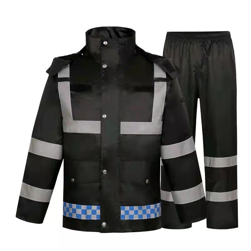 特点:1.多功能型,防雨防风保暖,修身设计2.面料双层内衬,面料柔软透气;带有夜光条设计,出行可靠;时尚型隐藏式防雨帽,雨帽可自动调节,缝纫处全方面进行封胶处理防漏雨,拉链加翻盖门襟,领口上端有搭扣。3.采用涤丝纺面料复合而成,面料柔软,零下10°不发硬,不脱层,年久不老化。