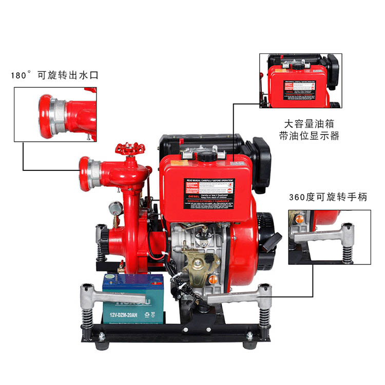 整体结构紧凑、体积小、重量轻、压力大、运行可靠。具有长时间连续运行、冷启动迅速等特点;主要用于城镇、森林、工矿企业灭火,也可用于给消防车供水、城市排涝等,是消防队、森林灭火的装备。