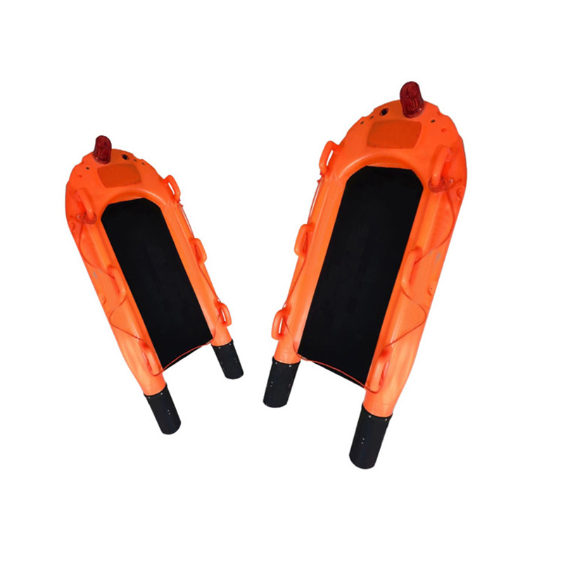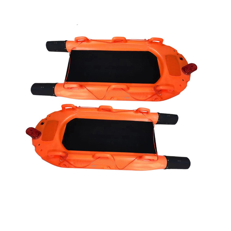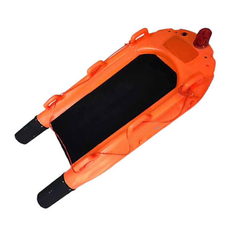6)救助设施:产品便于人体躺俯,装置上有多个抓扶把手和绳缆,便于拉抓,有卡扣人体绑带,固定躺卧人员;产品还配有救助卡扣带,可对昏迷者、拒救者或遇难者实施水上拖拽;