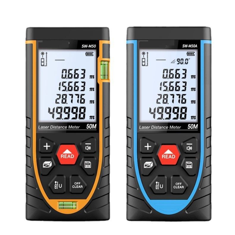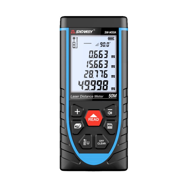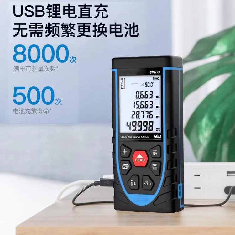 开机后默认进入单次测量模式,按READ键发射激光选定测量点,再按READ键测量数据显示在屏幕下方。待测模式下长按READ键进入连续测量状态,屏幕辅助显示区会显示此次连续测量过程中的大小峰值。为保证仪器精度,提供了自助校准功能,用户可根据误差调整,调整范围为-9~9mm。