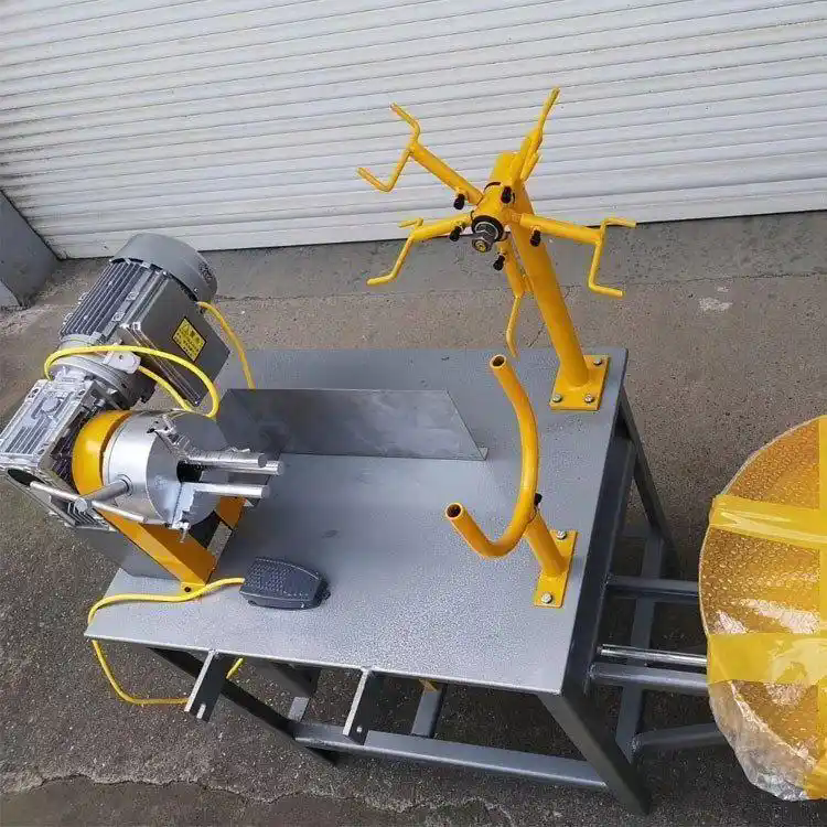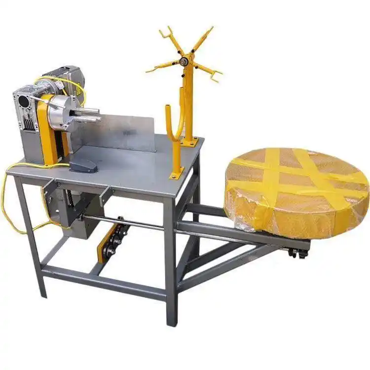 消防水带捆扎机,包括:机架,旋转缠绕装置,接头夹紧装置,接头滑动装置,拉力调整装置,铁丝导向装置,铁丝盘,铁丝夹紧装置,其中所述接头夹紧装置与旋转缠绕装置固定配合工作,所述接头滑动装置由横连杆,纵连杆,连杆支架,滑动调节手柄组成,本实用的滑动手柄利用杠杆原理设置于铁丝缠绕位置之外,操作省力;避免需要用手拉动铁丝造成的人员损伤风险。
