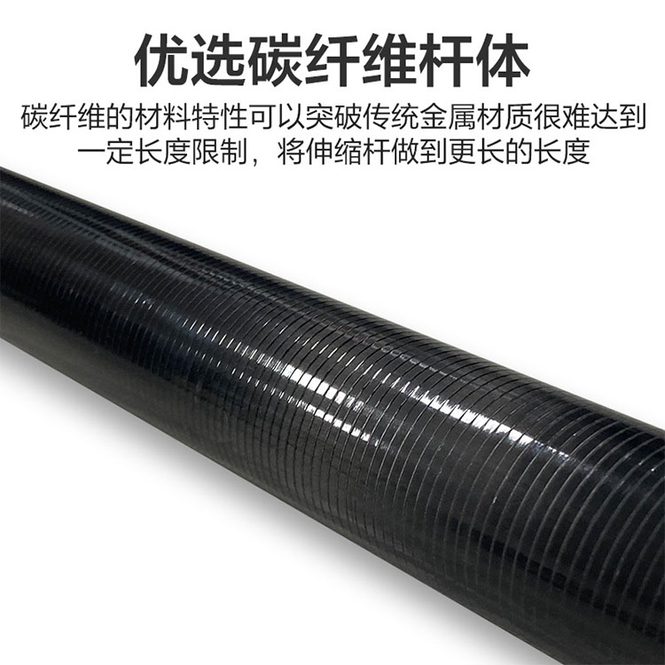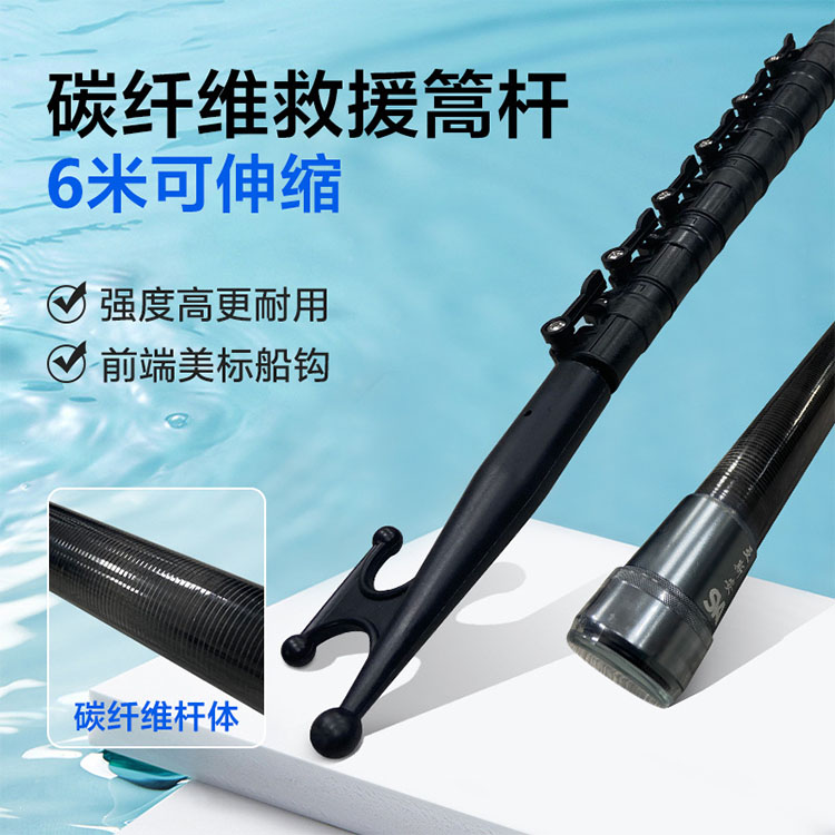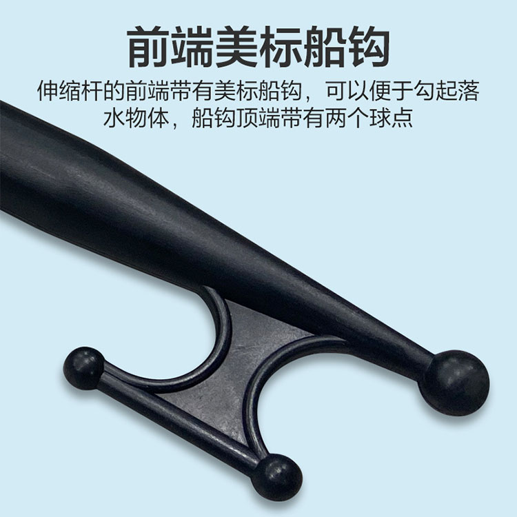 传统的金属材及叫生竹出丁目身材科特性的限制,很难达到一定的长度。碳纤维的材料特性可以突破了这一限制,所以可以将伸缩杆做到更长的长度。 伸缩杆的前端带有美标船钩,可以便于勾起落水物体。