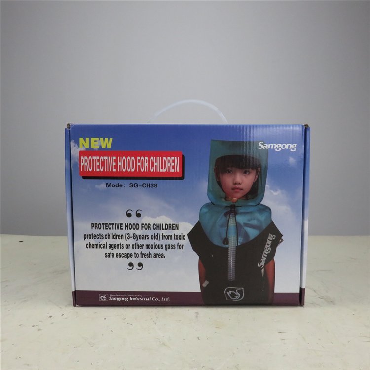 适合儿童(3—8岁)使用,为有效回避战争毒气或有害环境而设计的防毒面罩。利用送风机将外部空气通过滤毒罐送入头罩内,形成密闭正压,使得呼吸方便,活动无不适现象