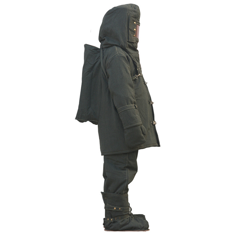 用耐火纤维布、毡、舒适层、防水层等多层结构制成,是消防人员进入火场进行灭火战斗和抢险救援时穿着的服装,是消防队员防护装备一,有防火、隔热、抗辐射热渗透性能。性能参数:防火焰温度850℃,防辐射温度1050℃重量:<12kg特性:有耐火隔热性能,可1000度火焰温度。款式:分体式、连体式。整套服装包含上衣、背带裤、头罩(带镀金视窗,内置消防安全头盔)、防火耐温手套、避火鞋。用途:消防员短时间穿1000度火区抢险救援作业。